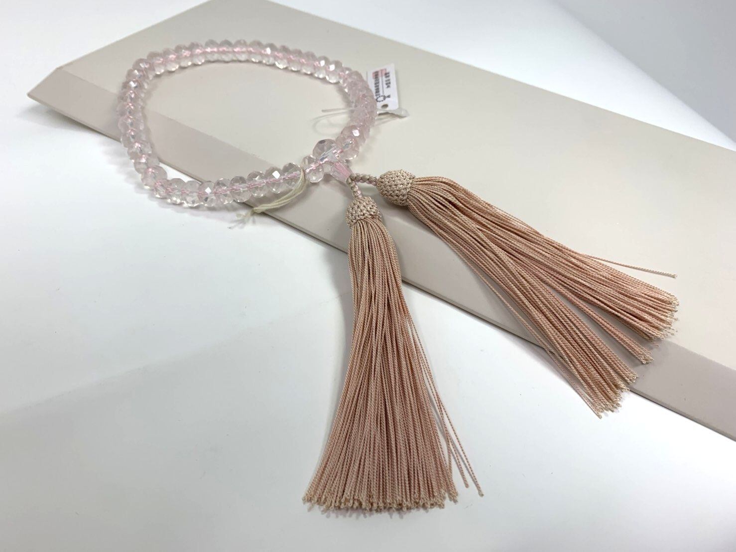 桜の花の様な薄ピンク色と、美しい透明感を合わせもった紅水晶のお数珠は、やわらかな風合いをもち幅広い年代の方にお持ちいただけます。あまり見かけないミカン玉に切甲カットが施されているのも目を引く一品です。房は1本1本が通常より細い正絹枝垂房を使用しており、より女性らしい雰囲気が魅力です。