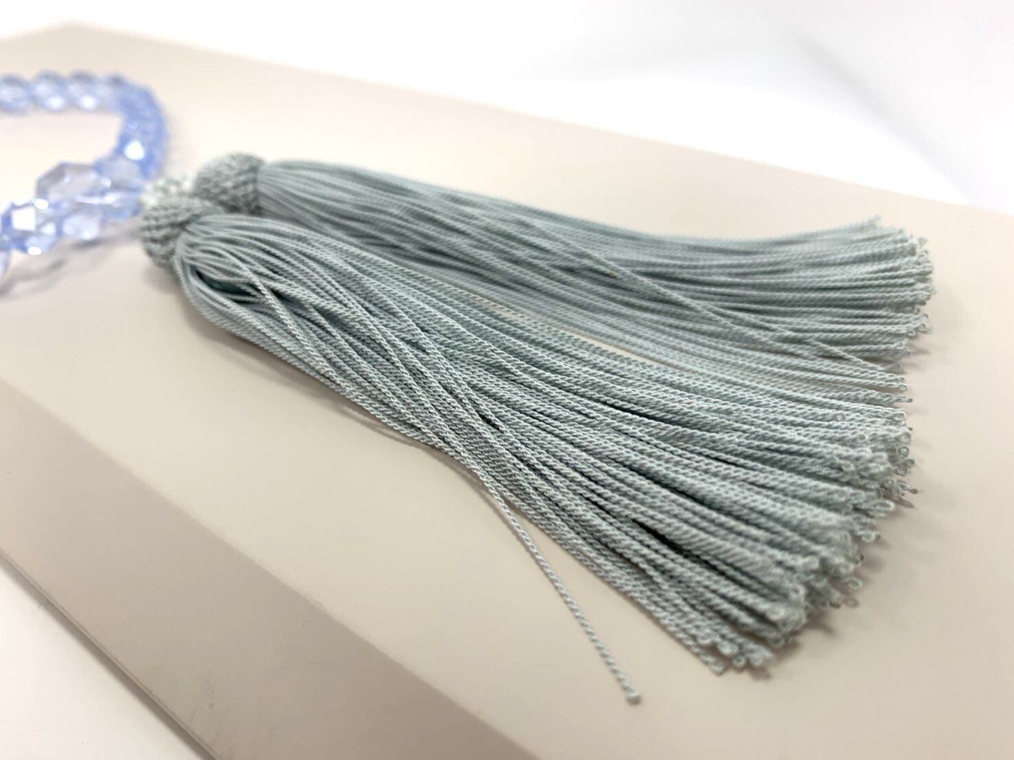 水晶の中でも青色のものをブルークォーツといいます。澄んだ海のように神秘的な青色が美しいことからアクアクォーツとも呼ばれています。エレガントな総切子で仕立てられているので女性らしく上品な表情が引き立ちます。房は1本1本が通常より細い正絹枝垂房を使用しており、より女性らしい雰囲気が魅力です。