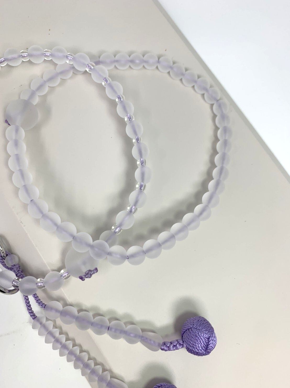 艶消し加工をした水晶で仕立てたお数珠です。藤色の通し糸が艶消し加工をした水晶からほんのり見え、上品な雰囲気の仕上がりになっています。房は藤色の正絹糸で編み込んだ梵天でほどけにくくなっています。