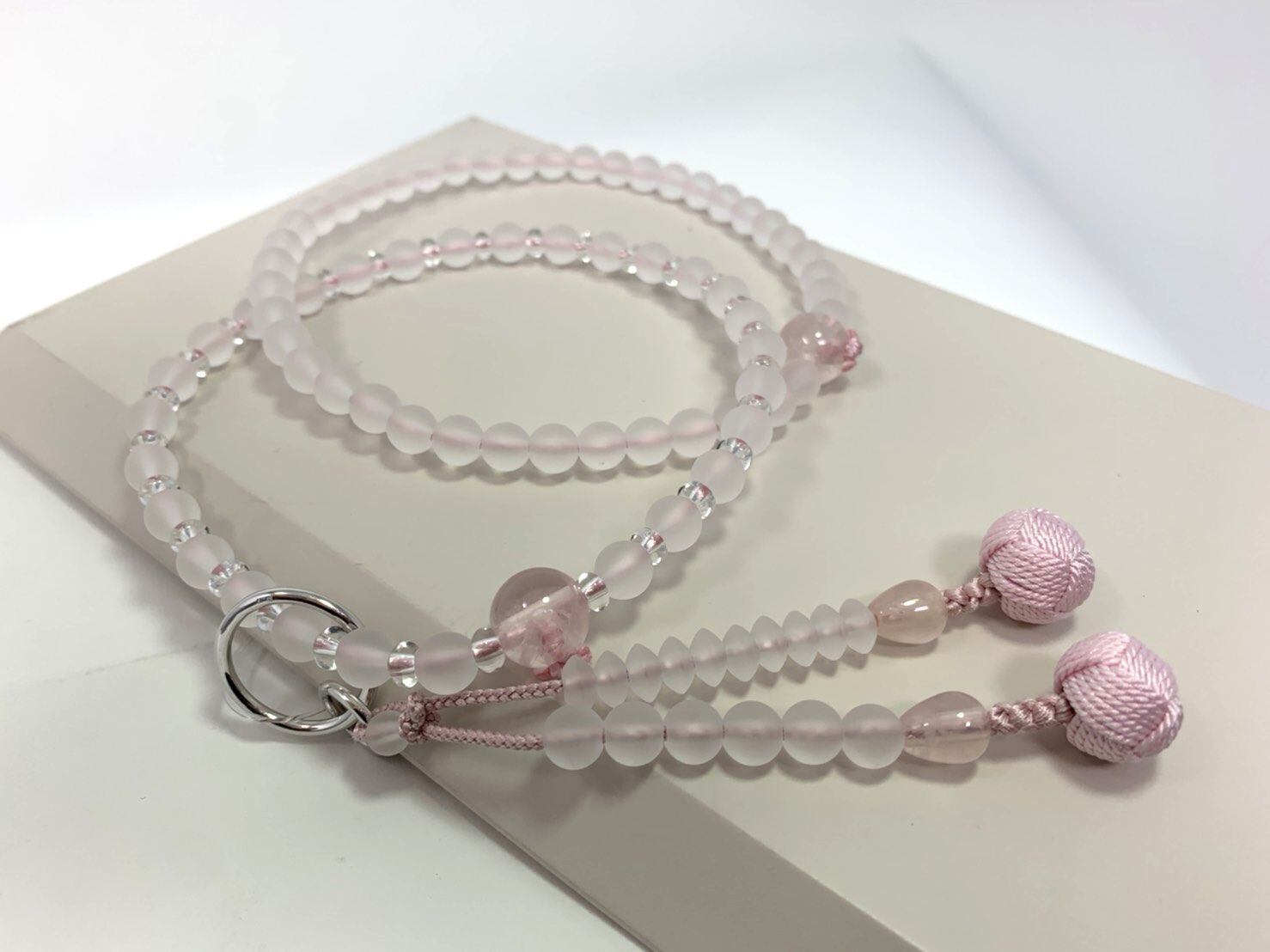 艶消し加工をした水晶と優しいピンクの色合いが人気の紅水晶で仕立てたお数珠です。ピンク色の通し糸が艶消し加工をした水晶からほんのり見え、優しい雰囲気の仕上がりになっています。房はピンク色の正絹糸で編み込んだ梵天でほどけにくくなっています。