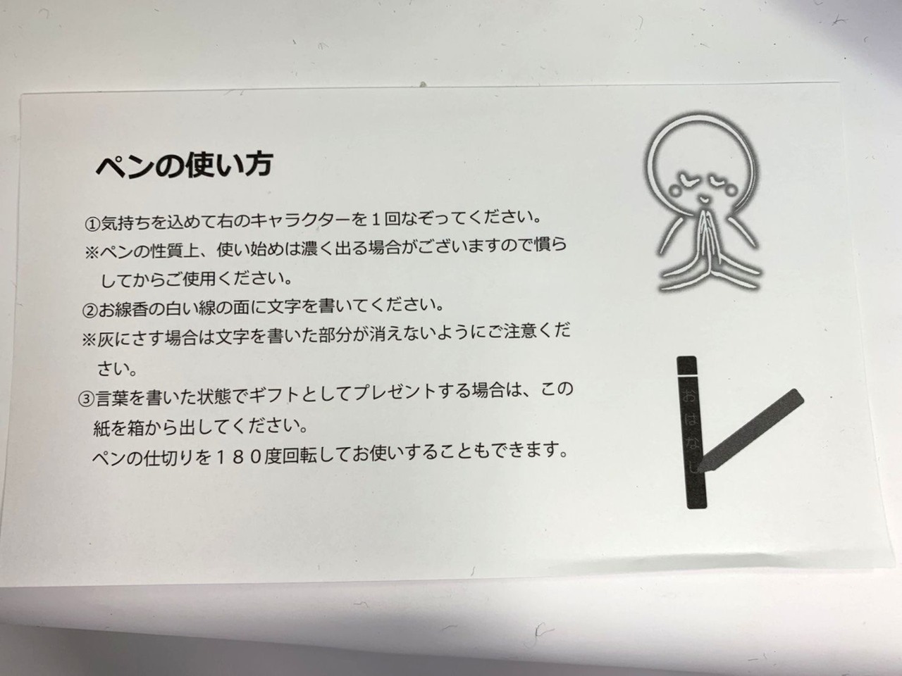 専用ペンで線香に文字を書き、火をつけると灰がそのまま残って、